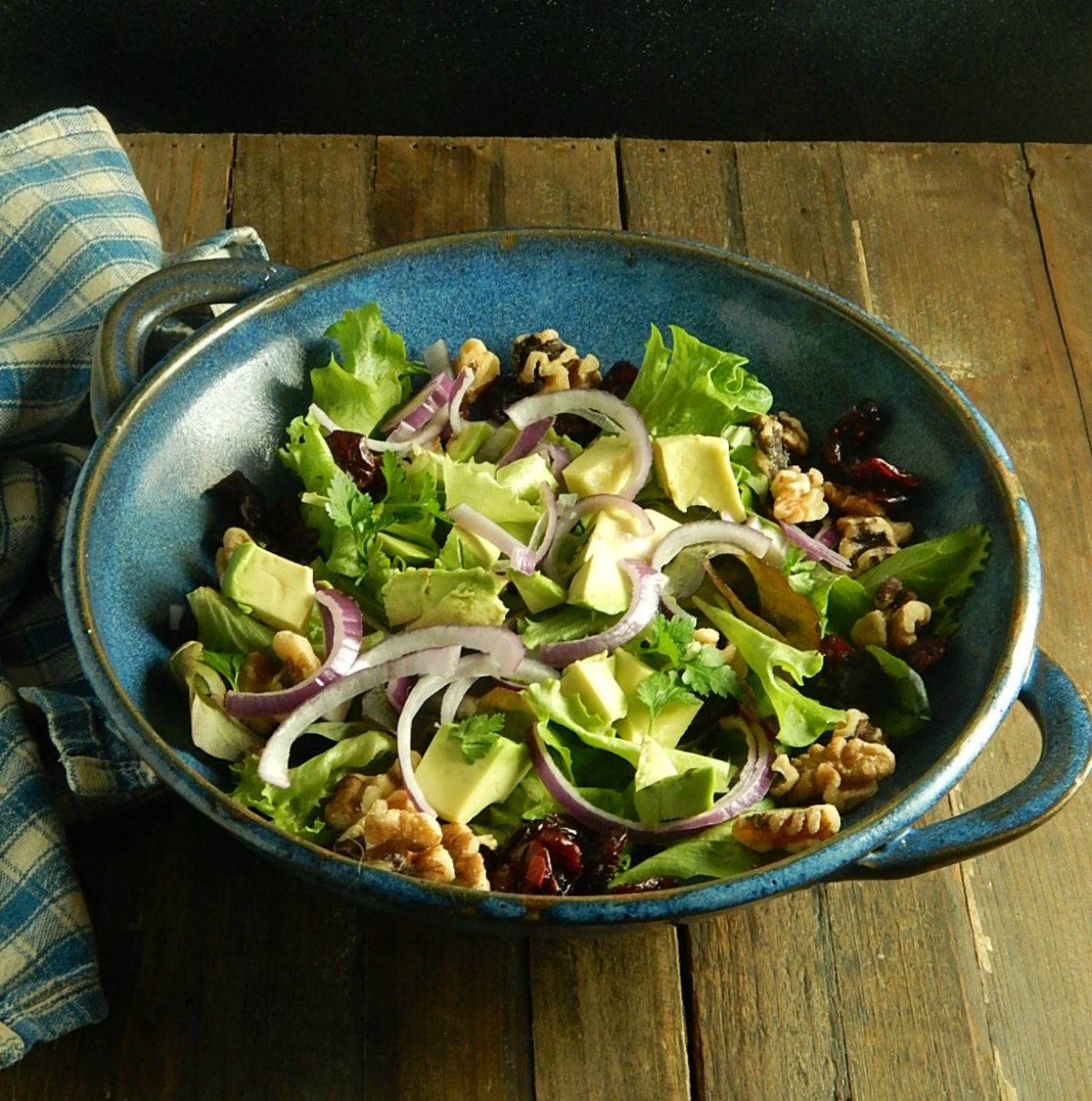 Add the diced avocados and chopped walnuts to the salad.